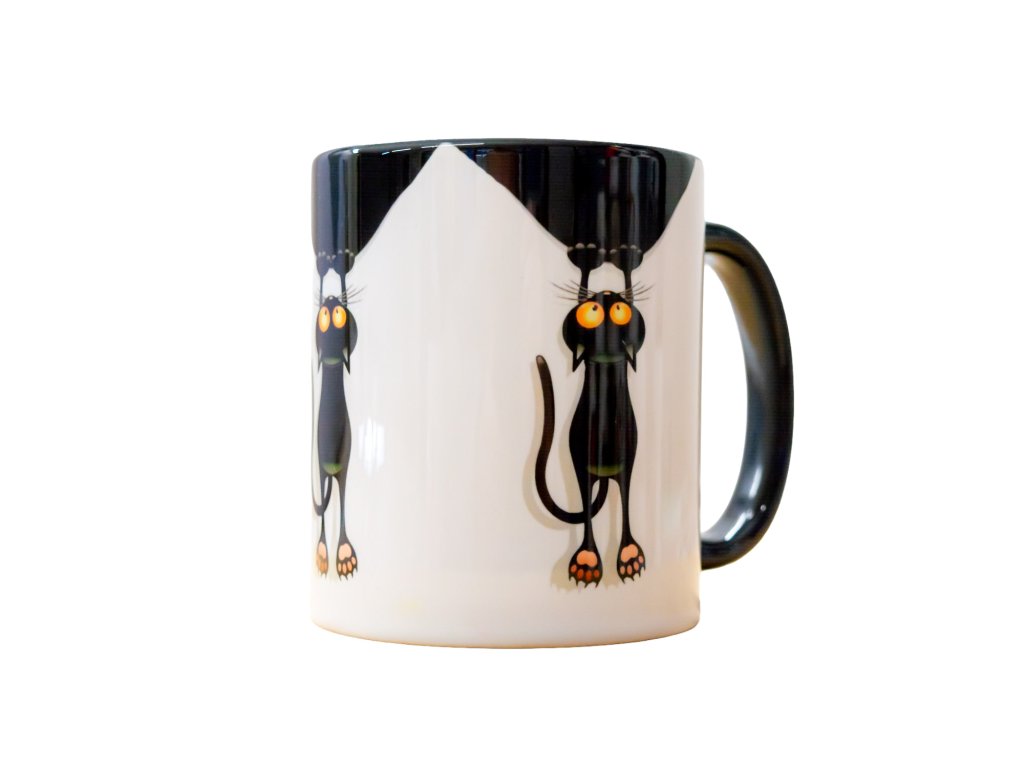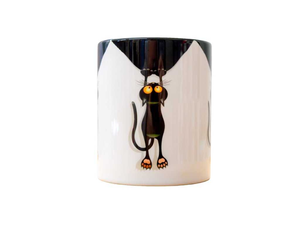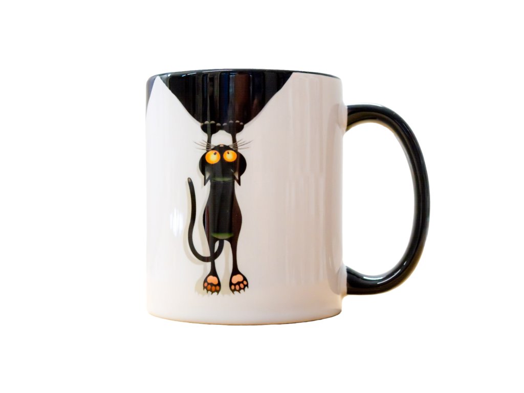 Stylový a vtipný keramický hrneček s motivem kočky visící na lemu hrnečku. Tento hrnek potěší každého milovníka koček.