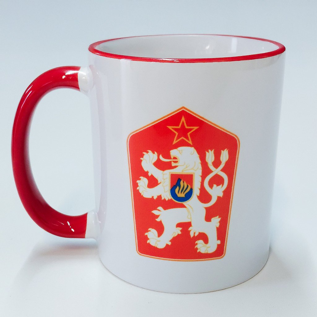 Hrnek s historickým znakem ČSSR – socialistické období, červený lem a ucho