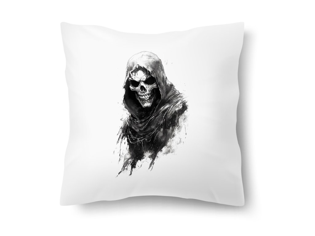 Dekorační polštářek 40 × 40 cm s temným motivem lebky v kápi. Stylová hororová dekorace pro váš interiér i originální dárek pro fanoušky temného designu.